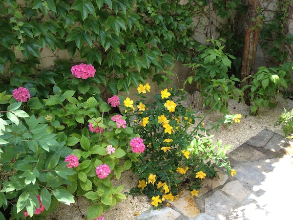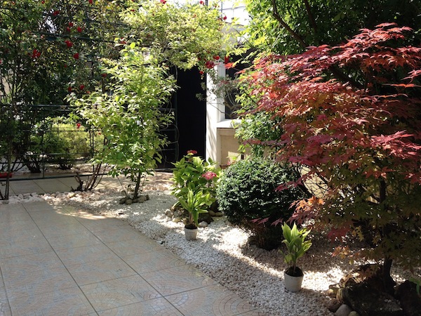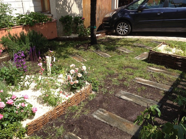Creation d'un jardin avec massifs fleuris, potager en carre, plantes aromatiques et medicinales.